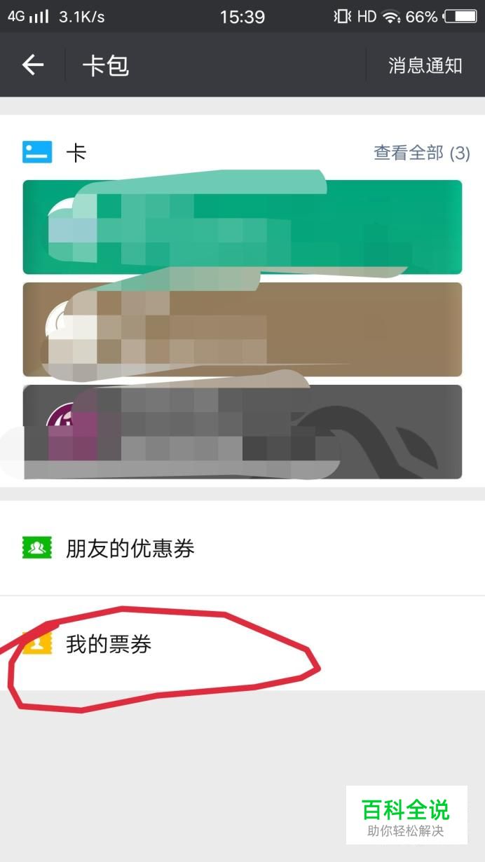 进入卡包后,找到我的票券并打开;