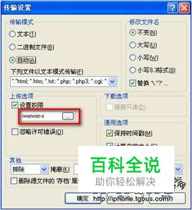 点击左下角的“传输设置-自定义”,可在弹出的设置窗口中设置权限为0777,即我们平时所说的最大运行权限(所有的复选框都是选中)。