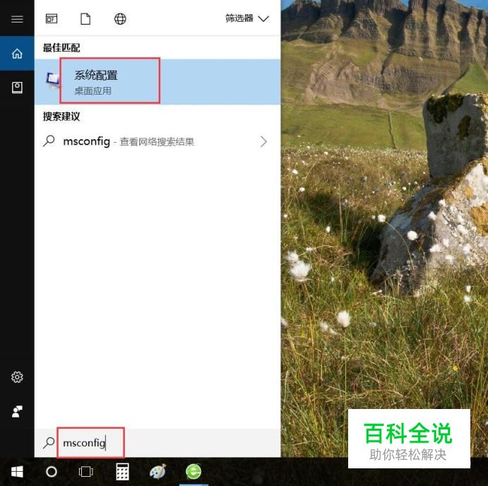 我们可以从系统配置中来设置,点击Win10系统任务栏搜索图标,输入“msconfig”关键字,并在搜索结果中点击打开系统配置设置。