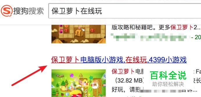 打开搜狗搜索,输入‘保卫萝卜在线玩’进行搜索,然后就可以找到在线玩的网站了,点击打开。