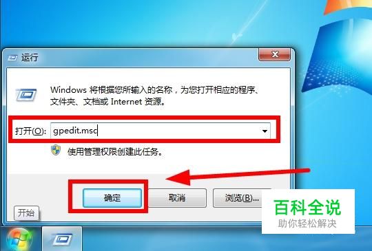 按住“Windows+R”组合键,弹出运行对话框,在运行对话框输入“gpedit.msc”,点击“确定”