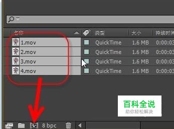 打开AE软件后,我们将已经准备好的素材导入AE主页面中的项目窗口。然后将这些素材拖至【新建合成】,就是下图箭头所指的按钮。
