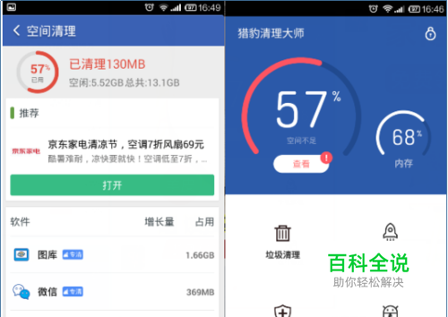 定时清理缓存 我们在使用手机应用时,会留下各种缓存文件,在线视频的缓存、大量的聊天记录等等,简单应对方法是安装某些清理大师,没事就清理一下。专业点的可以自己进入文件管理里