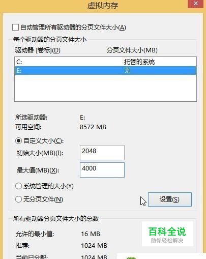 最后选择系统分区以外的分区,选择“自定义大小”,最小值为内存大小两倍,最大值自定。再点设置,重启后生效。如图所示: