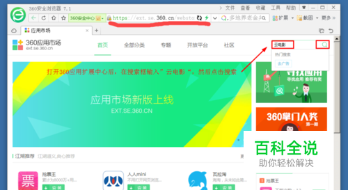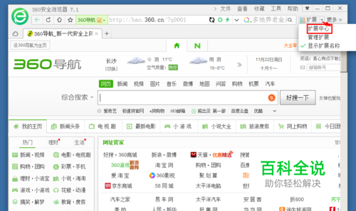 打开360浏览器,然后在360浏览器中点击“应用扩展”的下拉图标,打开应用扩展中心,如图