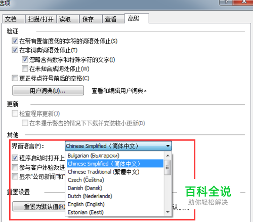 点击‘高级’选项,在界面语言下拉列表中选择需要的语言,里面包含了常用的简体中文、繁体中文、英文和日语等,然后点击确定。