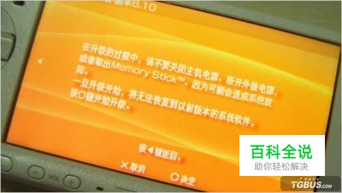 首先确认PSP的电量在78%以上,并且在升级过程中不能关机、取出记忆棒或是断开电源,否则会导致PSP变砖) 打开PSP主机,在游戏列表中你应该能看到PSP 6.10升级程序,运行该程序。