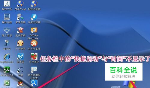 任务栏还原步骤: 1,打开电脑桌面,发现任务栏的“快捷启动”栏与“时间”不见了。