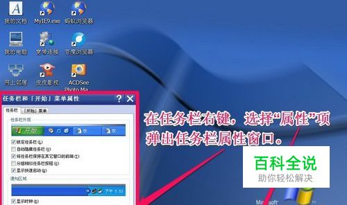 2,恢复方法,在任务栏用右键,弹出右键菜单,选择“属性”这一项。