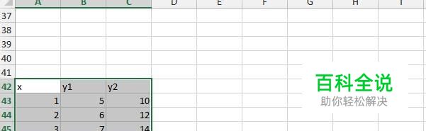 我们看下面的表格,有三列数据,自变量X和两个因变量y1和y2,我们要用散点图表示x和y1的关系,同时要用散点图表示x和y2的关系,如何将两个散点图绘制在一个图上呢?