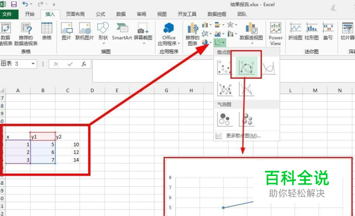 先绘制第一条曲线,选中x和y1两列数据,然后选择一个散点图,如图所示