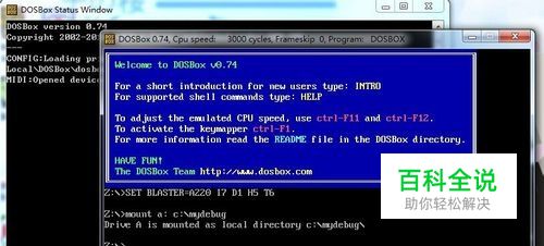 打开安装好的dosbox. 输入命令 mount a: c:\mydebug 前面的a随便取 后面的c:\mydebug 为debug.exe的存放路径。