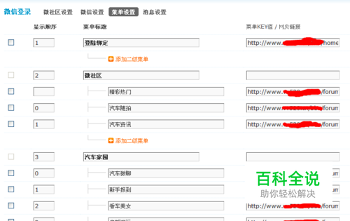最后在论坛网站后台进行微信菜单设置,您可以设置最多3个菜单,每个菜单可以创建最多7个子菜单,并同时在右侧边框设置菜单KEY值/网页链接,设置好之后提交菜单发布即可。