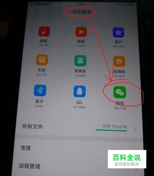 在手机屏幕上面点击文件管理,在手机屏幕上弹出手机管理页面,可以看到微信(红圈中)。
