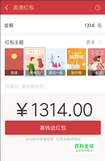 来到普通红包页面,点击金额,输入额度,点击“红包主题”,想选择其他的可以点击“更多”,将会看到更多主题,还可以输入祝福语,如图所示