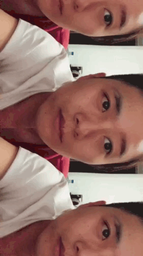 两个人坐在一起,翻转手机对准自己的面部,然后调节位置,使各自一半的脸在镜头里重合。