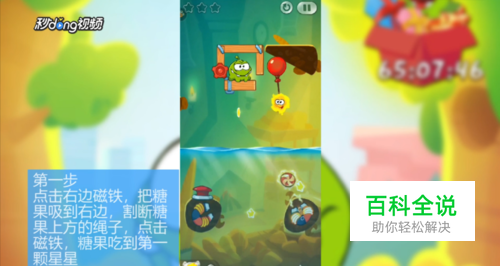 点击右边磁铁,把糖果吸到右边,割断糖果上方的绳子。点击磁铁,糖果吃到第一颗星星。