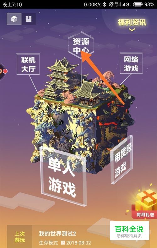 首先,我们点击游戏我的世界手机版,进入游戏之后,点击资源中心,如下图所示