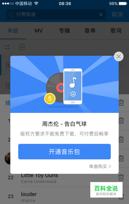 接下来到软件主页搜索一首付费的歌曲,然后点击试听,等待歌曲缓冲完成,在苹果手机上是看不到缓冲文件的,接下来要用电脑来操作。