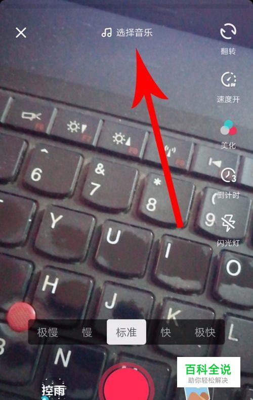 抖音中打开拍摄界面,在准备拍摄视频作品前,点击顶部中央位置的“添加音乐”按钮,注意此按钮不是太明显