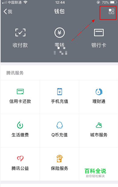 打开微信钱包,点击钱包页右上角的「田字格」