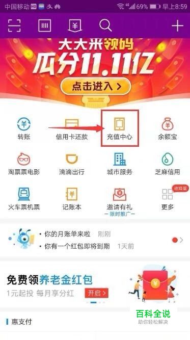 进入支付宝页面后点充值中心;