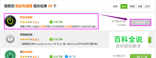 下载并在手机上安装 “解放电源键”应用软件。 当然,还有很多具有相同功能的应用,比如下图中的“释放电源键”、“快捷电源键”等,而且具体使用方法跟“解放电源键”大同小异,所以此处以“解放电源键”为例来讲解。