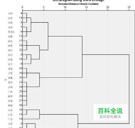 龙骨图的本质是让我们看到聚类的过程:为了清晰可见,我们使用spss20.0产生的龙骨图,最左侧一列数字代表不同的省份,对省份进行分类,第一次分类结果是从各个数字延伸出来的直线相交点,如图所示,红色方框就是第一次聚类产生的类别。