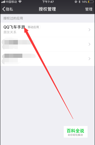 在授权管理页面,可以看到微信授权过的应用“QQ飞车手游”。点击“QQ飞车手游”就可以进入更改页面。