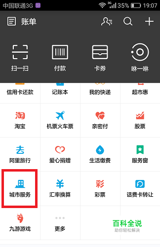 打开手机中的支付宝客户端,进入支付宝,在其首页,找到城市服务,如下图所示;