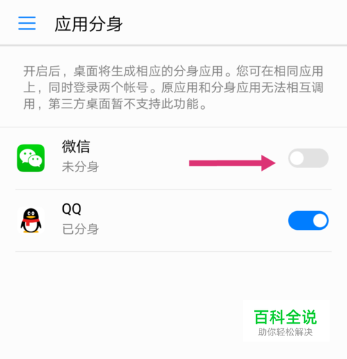 进入“应用分身”后,出现微信未分身状态,右侧灰色按钮向右拉开启微信分身。
