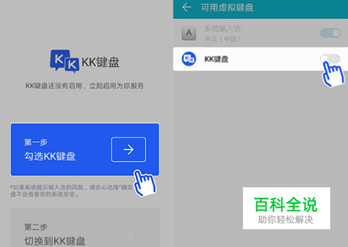 输入法设置: 根据设置引导,先启用KK键盘,再切换到KK键盘。