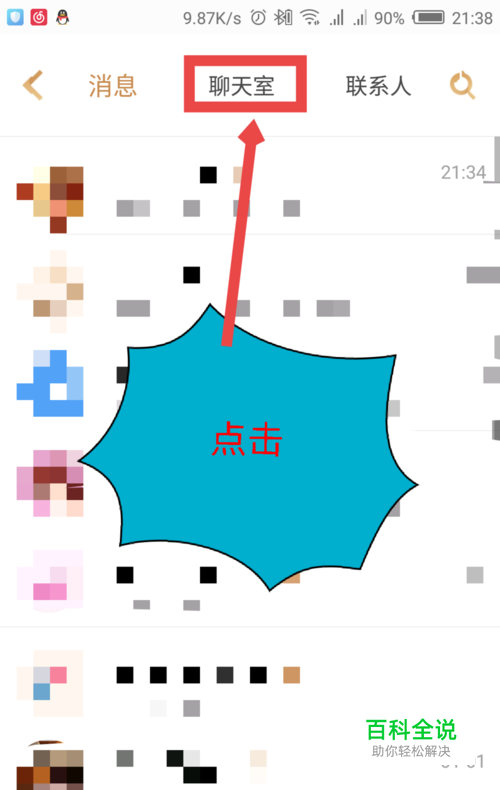 点击后,打开聊天信息通讯界面。在顶部导航菜单中,点击右边的聊天室选项。如图所示
