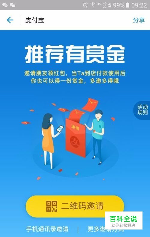 点开后可以先看看【活动规则】,那里非常详细的介绍了所有规则。我已经领取到了6块2了,这个是直接到支付宝余额可用于消费的,不是优惠券什么的,还是挺实在的。点开【二维码邀请】,进入下一步。
