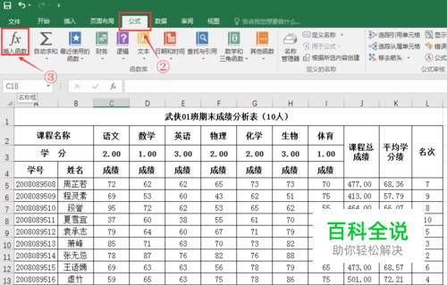 统计优秀率一般先统计出优秀人数,然后再用优秀人数/总人数×100%;如下图,先选定C18单元格(如①),再选择上方【公式】菜单(如②),再后选择【插入函数】选项(如③),将会弹出函数选择对话框。
