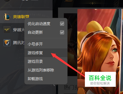 右键点击英雄联盟,在弹出的菜单栏中选择“游戏修复”,如图所示;