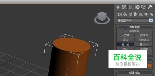 打开3d max软件(这里用的3d max2010版的软件)。可看到四个视图窗口,在窗口的右边,鼠标左键,单击面板的【标准基本体】按钮,选择【圆柱体】,在透视图上,拖动绘制一个平面出来,并可修改颜色为棕色,如下图所示。