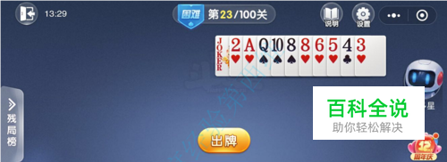 第23关关卡如图所示: 一对4起手,对牌出完,单张引出电脑大王;