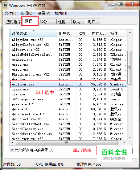可以通过Tab和方向键选择“进程”,找到“explorer.exe"并选中,再点击右下角的”结束进程“。