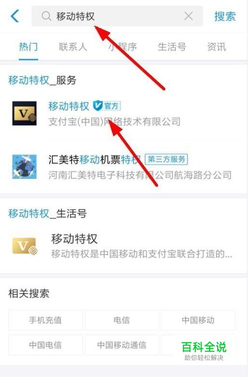首先我们在支付宝的搜索里面搜索“移动特权”进入小程序。