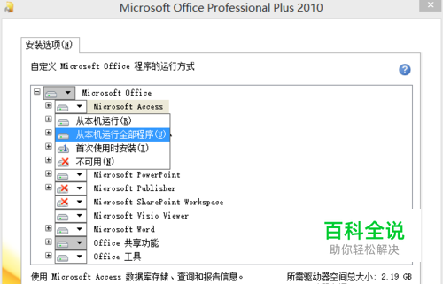 启动安装程序,进入“安装选项”,单击Access旁边的按钮,在弹出菜单中选择“从本机运行全部程序”,单击继续,进入“配置进度”界面。