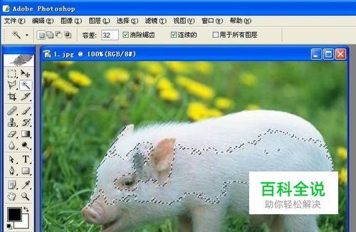 选择左侧工具栏中的魔术棒工具(如果不认识此工具,可以把鼠标放在工具的下方,软件会自动提示是什么工具),在小猪的身上点击,会看到闭合的曲线,但并没有完全选择小猪(因为小猪身上的颜色存在一定的差距)
