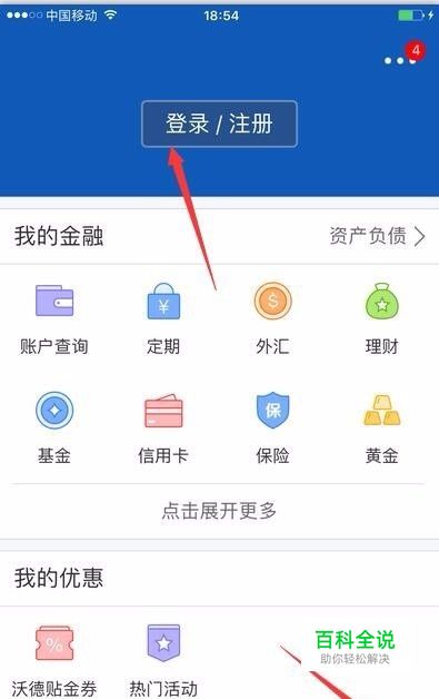 打开手机,找到并点击交通银行APP“我的”页面中的“登录/注册”;