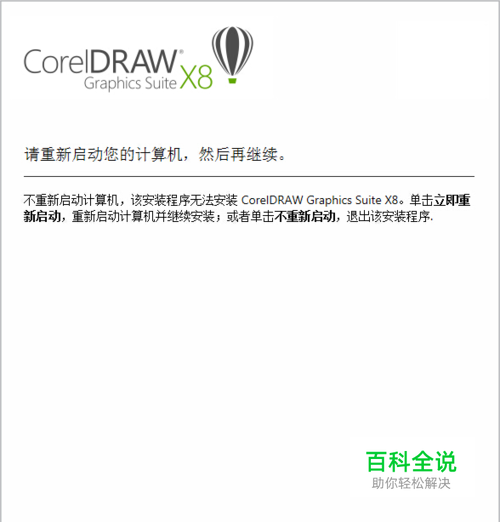 有的同学在安装完成 .NET Framework 4.6之后会跳出如下提示,这是根据不同电脑出现的重启界面,如出现以下界面,单击“立即重新启动”即可继续安装CorelDraw X8。