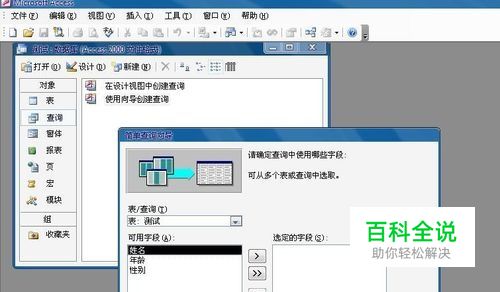 因为我们这里的两个表进行了数据合并,我们直接在两个表中查找来作为演示,单个表查询自然就会了。选择测试表中的年龄和性别字段(选中字段名后点击中间的大于号,移动到右侧),再选择附表里的姓名和学历字段。结果如下图。