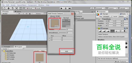 选择创建的地形“Terrain”在右边的属性的"Terrain"中选择"paint Texture(画笔)",笔刷(Brushes)的类型,然后Texttures中“Add Texture”添加贴图,把Img中的图片直接拖动到第一个框中,然后“Add”,现在定贴图就贴上了。