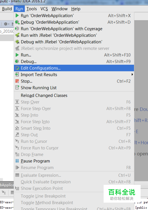 打开IntelliJ IDEA,点击菜单的“Run”->“Edit Configurations...”,然后会打开运行设置弹框。