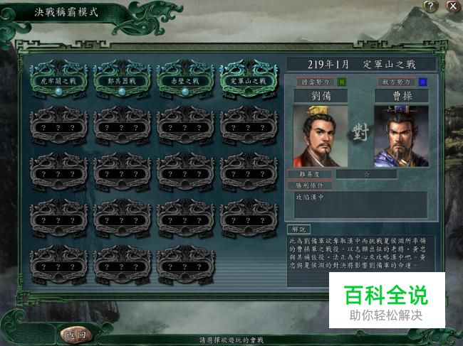 定军山之战属于简单难度,这是因为游戏设定了很多对我们有利的条件,当然如果不注重策略猛冲狠打也会挂的很惨。剧本选择定军山。