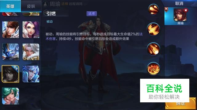 【被动技能】引燃:周瑜的技能将引燃目标,每秒造成目标最大生命值2%的法术伤害,持续4秒。技能命中被引燃目标会造成额外效果(分析:玩过周瑜的玩家或者对手是周瑜的玩家都不陌生,这个英雄就是不但会用火而且到处放火,而且点火必燃,伤害也不会少。)