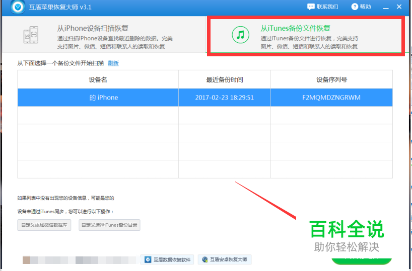 将手机与电脑连接,打开软件,选择”从iTunes备份文件中恢复“的恢复方式。